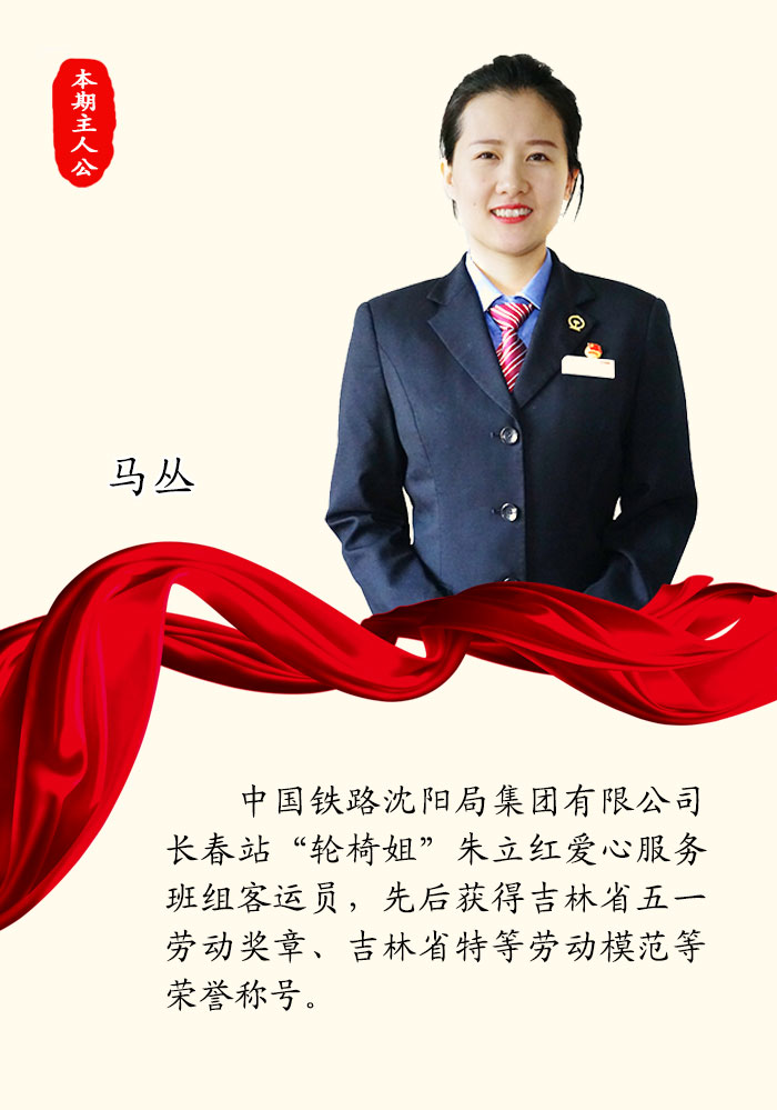 9年前,參加工作不久的馬叢,加入了長春火車站“輪椅姐”朱立紅的愛心服務班組,作為全國勞動模范朱立紅的弟子,她在朱立紅事跡的感召下,把更好地服務重點旅客作為自己的追求。在朱立紅的言傳身教下,馬叢多次參加勞模座談會和先進事跡報告會,她把眼光跳出本行業,到龍嘉國際機場金達萊班組取經,認真學習全國勞模郭明義、李萬君等先進典型事跡,在典型的感召下,她決心在自己的工作崗位上,讓新時代勞模精神發揚光大,讓人民鐵路為人民的宗旨鐫刻在服務旅客過程中,更好地為特殊重點旅客服務。
