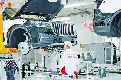 在位于長春市的一汽紅旗工廠總裝車間,工人在裝配車輛。新華社發(fā)