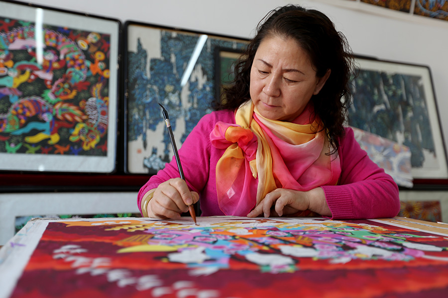 色彩的艷麗與愉快的氣氛,以及蝴蝶的“湊熱鬧”,激起了康梅花的創作靈感,從草圖到成稿,這件造型夸張、色彩熱烈且帶有鄉土氣息的作品,得到了大家的認可、給她帶來了榮譽,更讓她堅定了深入鄉村獲取創作靈感的信念。后來,《春雨》《東北情》等更多帶有鄉土氣息的作品,如雨后春筍般的涌現。