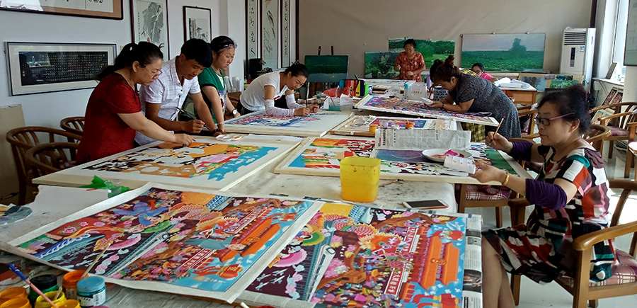 從一手握鋤頭,一手握畫筆,白天勞作,晚上執筆,到今天潛心研究、享譽圈內,康梅花在這條創作民間畫的道路上,已經走了很久,走出了很遠。