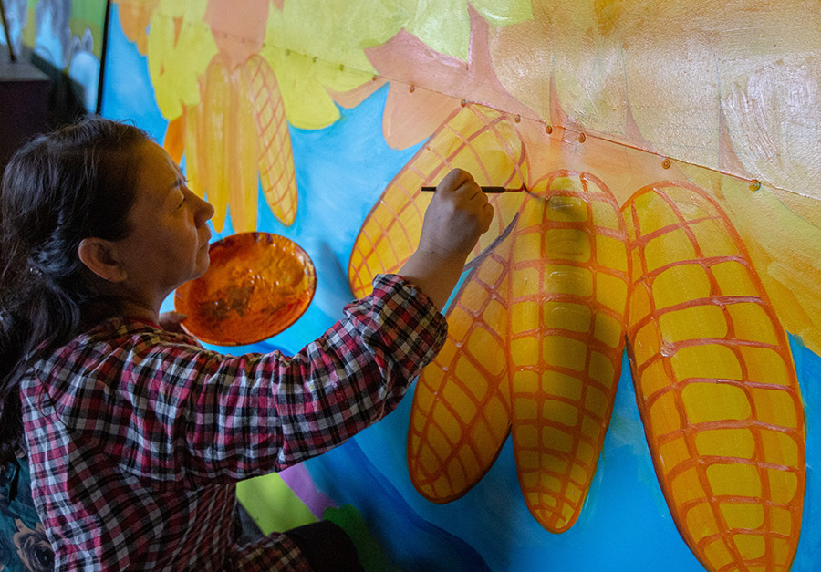 這是康梅花外出寫生時巧遇的一幕,也是她永遠忘不掉的最初記憶。從事民間畫創作近40年,在談起對哪件作品印象最深刻時,康梅花毫不猶豫地說出了成名作《多彩的六月》。