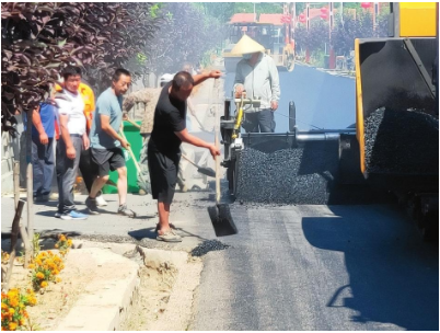 2020年,柳河縣交通局為二蘭線鋪設(shè)瀝青路面,途經(jīng)蘭山村主路1.51公里。圖為駐村干部和村民配合施工方共同為蘭山村鋪設(shè)瀝青。 (資料圖片)