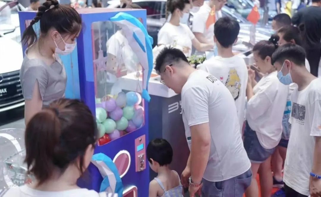 為了吸引消費者到自家展臺上參觀,各個汽車展商可謂用出了渾身解數。吉祥物玩偶、抓娃娃機、爆米花機、冰淇淋小攤、汽車游戲機……逛展的同時仿佛置身于游樂場,不論是大朋友還是小朋友都能體驗到汽博會帶來的快樂。