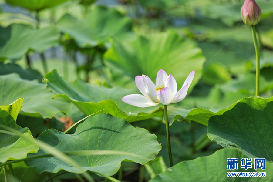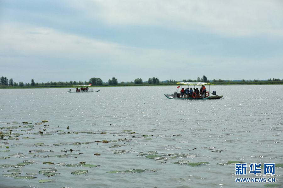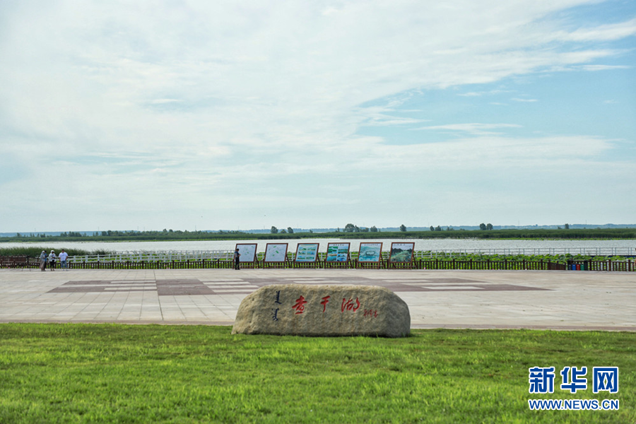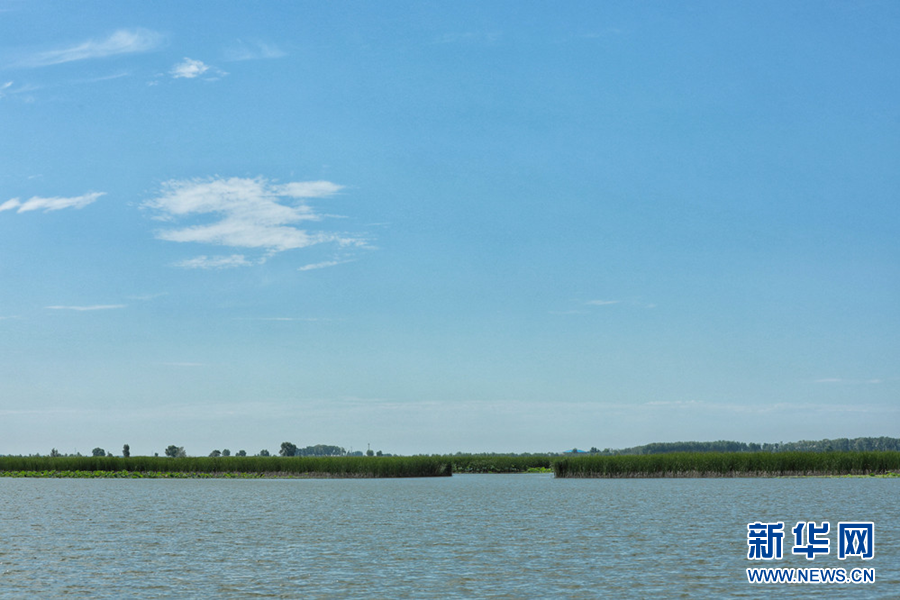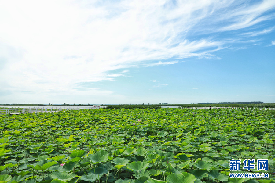 7月22日,暖陽下的查干湖波光粼粼,荷葉被微涼的風輕輕拂動,與冬天形成截然不同的景致。新華網王小驥 攝