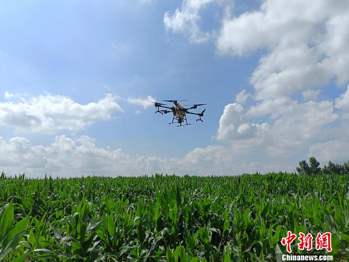 這里是吉林省四平市梨樹縣的百萬畝綠色食品原料(玉米)標(biāo)準(zhǔn)化基地,在充足的日照下,無人機正在為玉米田灑水撒藥。