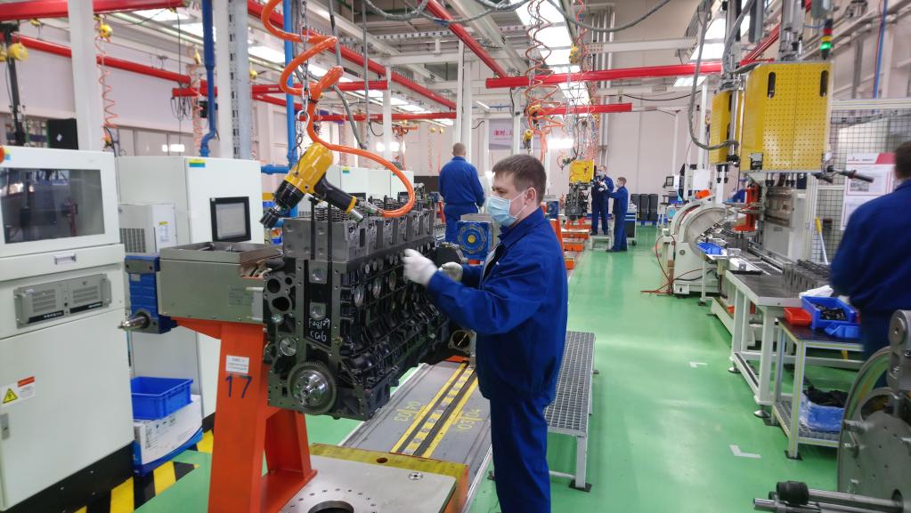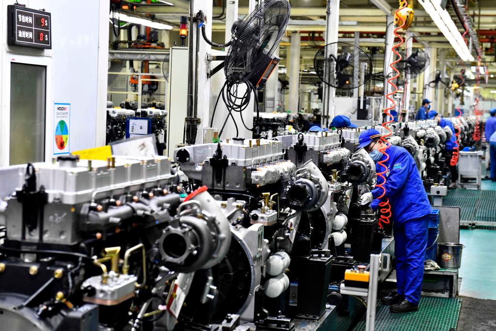 4月22日,在位于山東濰坊的濰柴集團總裝車間,工人在流水線上裝配發動機。(新華社記者郭緒雷攝)