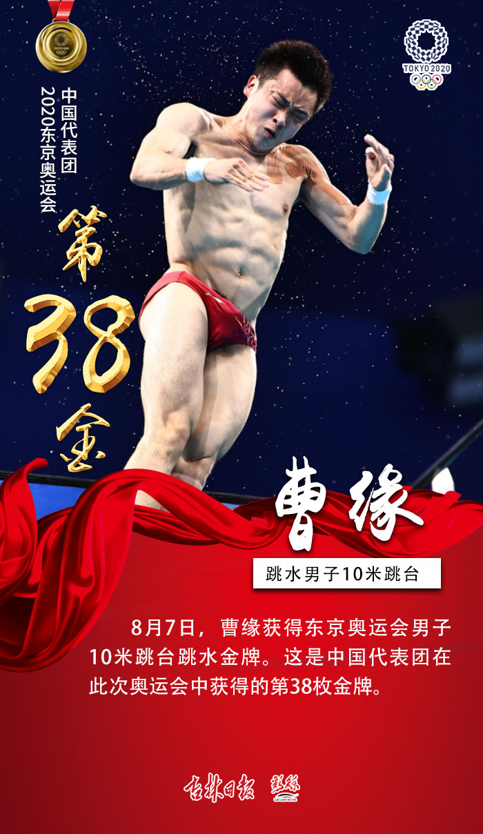 今日是跳水收官日,而第38金也來自我國的優勢項目跳水。在下午進行的跳水男子單人10米跳臺決賽中,我國選手曹緣以582.35分的成績奪得男子10米跳臺冠軍,隊友楊健獲得銀牌。至此,中國跳水隊“夢之隊”在本屆奧運會上共獲得7金5銀,華麗收官。