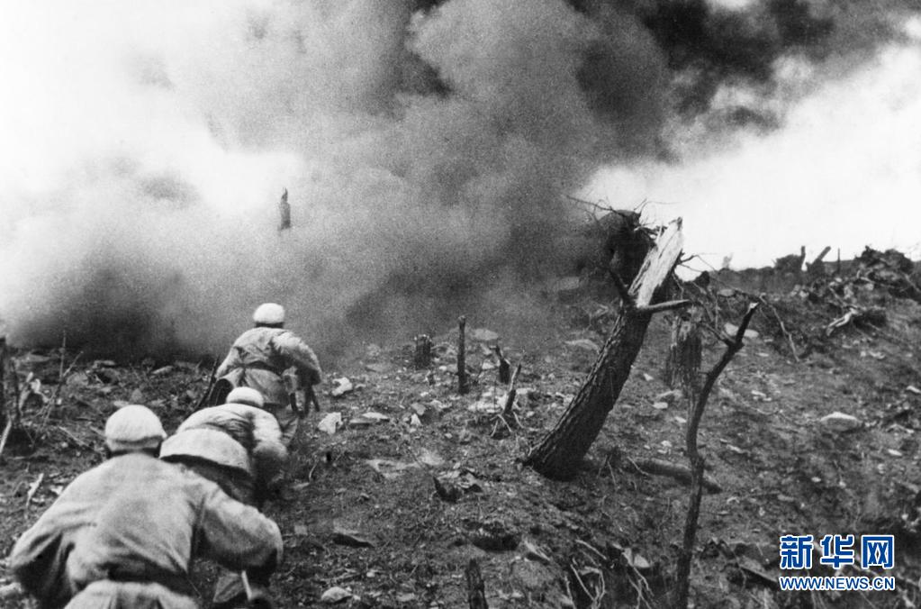 1952年,在上甘嶺戰(zhàn)役中,中國人民志愿軍指戰(zhàn)員在炮火支援下,攻上537.7高地北山。新華社發(fā)