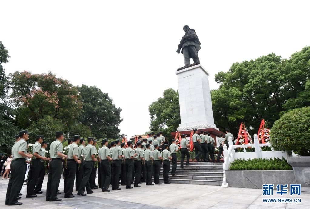 在位于重慶市銅梁區(qū)的邱少云烈士紀念館,武警官兵向邱少云烈士紀念碑獻花(2017年9月30日攝)。新華社記者 唐奕 攝