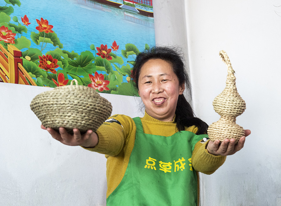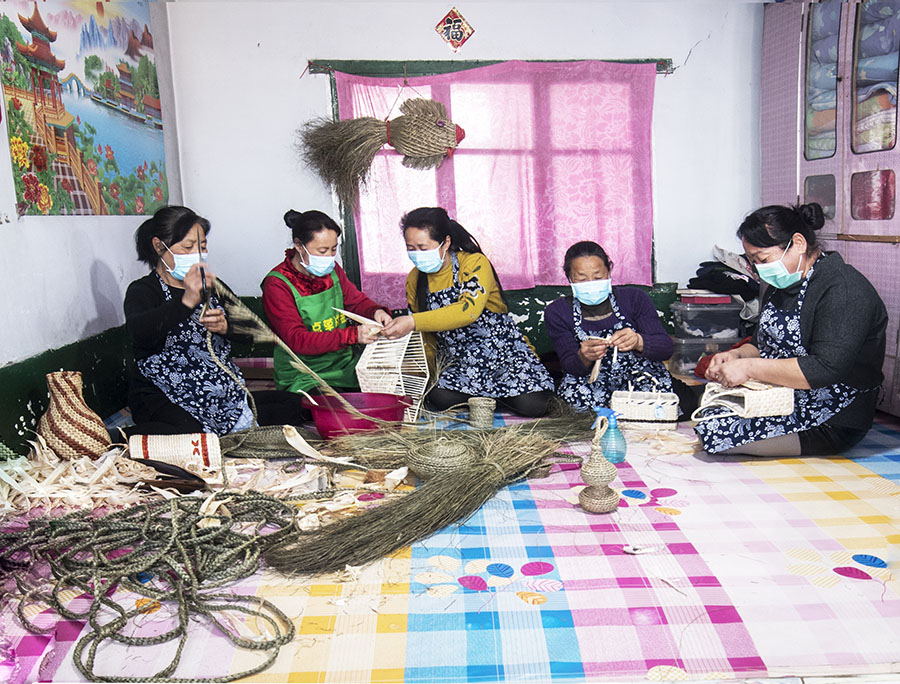 2017年,紀紅艷聯合10多名姐妹,創辦了南樓山專業合作社,注冊了“南樓山”商標,以品牌為引領,通過“合作社+農戶”的模式,發展草編電商,將姐妹們擰成一股繩,一起銷售草編手工藝品。每年農閑時,姐妹們平均每個月能掙到1500塊錢,大家都說這是在家門口掙”外快”。