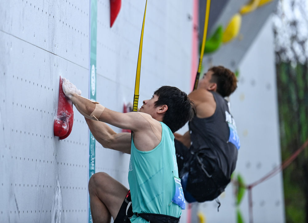 9月17日,中國香港隊選手陳翔志在第十四屆全運會攀巖男子速度預賽中。新華社記者王曦攝
