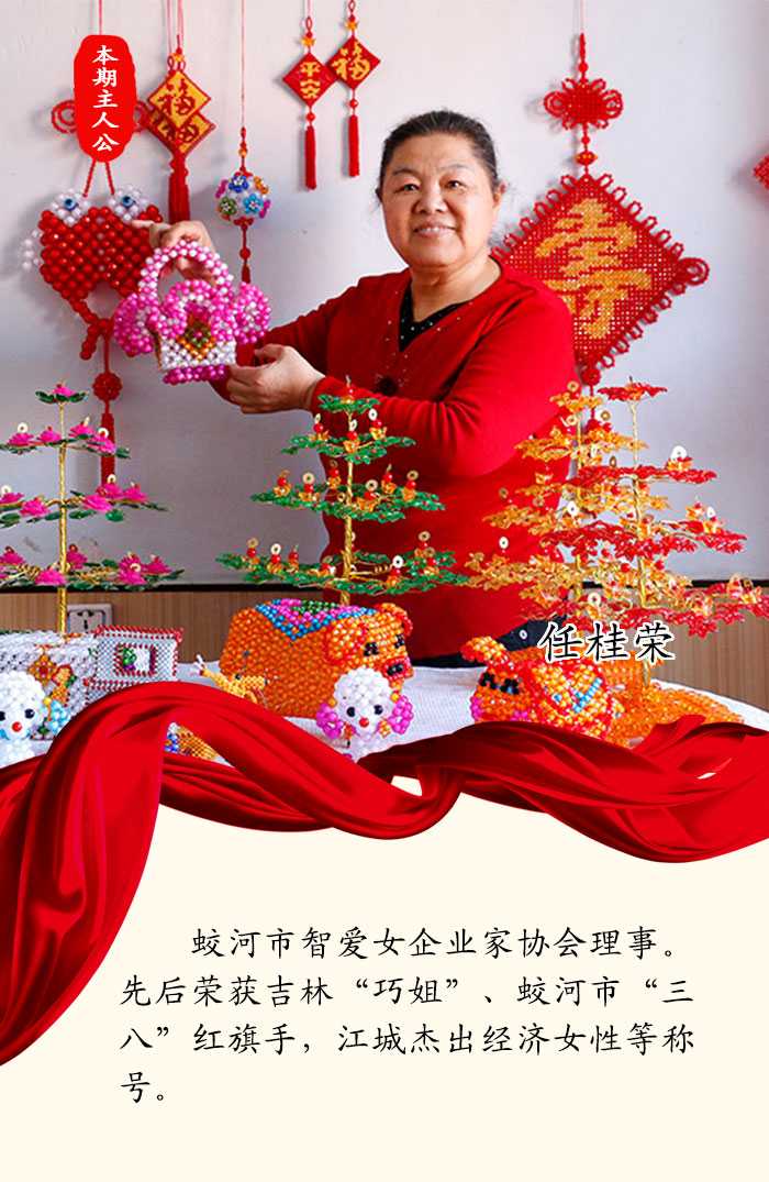 提起任桂榮任大姐,蛟河市新站鎮雙旺村貧困戶王洪雁至今仍充滿感激之情。身體殘疾的她和女兒都無勞動能力,一次偶然從電視中看到蛟河市婦聯組織的任桂榮珠藝編織培訓節目后,她給任桂榮打了電話。接到電話后的任桂榮久久不能平靜,“我這把年紀,只要能為社會作點貢獻,給這些貧困家庭帶來一點幫助,我就覺得值!”說干就干,就這樣,任桂榮和老伴兒帶著十幾斤的串珠,經過一路山路顛簸,來到了王洪雁的家。不僅送“貨”上門,更送“技”上門,很快,王洪雁掌握了串珠編織的工藝,可以拿著自己編織的串珠工藝品到集市上、旅游景區售賣,增加生活收入。