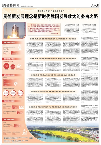 代表委員表示,2021年,我們立足新發(fā)展階段、貫徹新發(fā)展理念、構建新發(fā)展格局、推動高質量發(fā)展,黨和國家事業(yè)取得新的重大成就。奮進新征程、建功新時代,必須把新發(fā)展理念貫穿發(fā)展全過程和各領域,實現(xiàn)更高質量、更有效率、更加公平、更可持續(xù)、更為安全的發(fā)展,奮力奪取全面建設社會主義現(xiàn)代化國家新勝利。