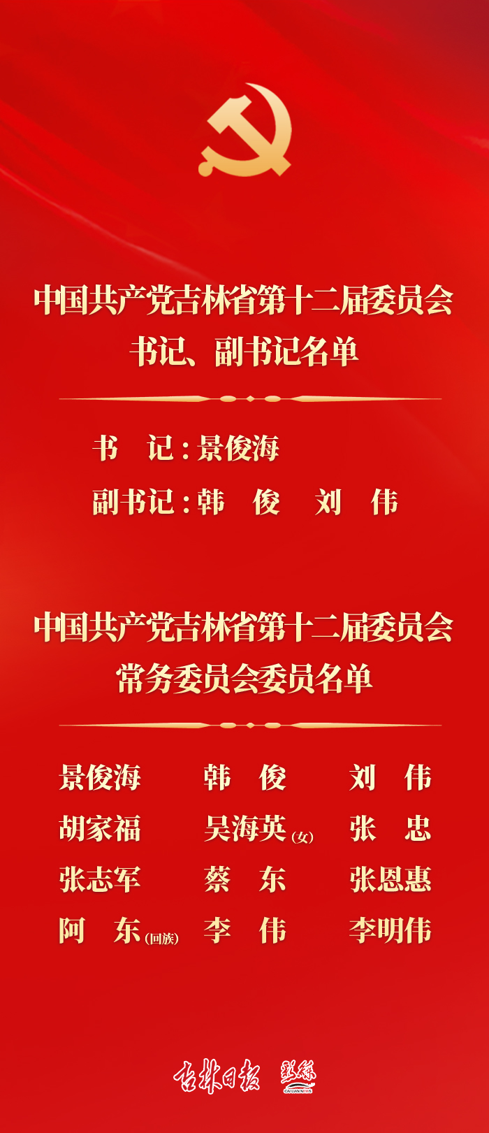 6月22日下午,中國共產黨吉林省第十二屆委員會第一次全體會議在長春舉行。會議選舉產生了中國共產黨吉林省第十二屆委員會常務委員會委員和書記、副書記。