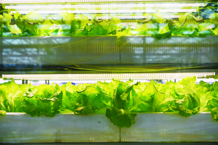 透過有限大小的窗口看,只見工廠內被五顏六色的光暈籠罩著,其間有4層栽培架,架子上是一叢叢植物,生菜、苦苣等長得郁郁蔥蔥。