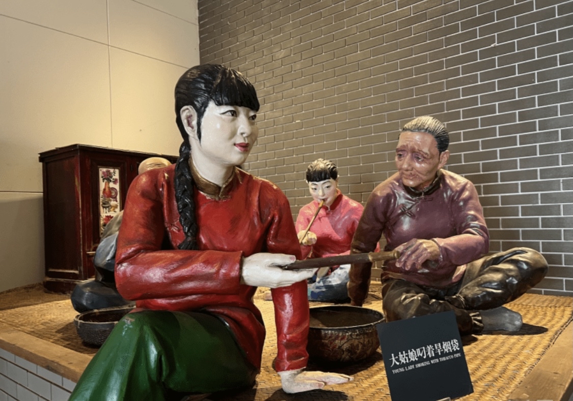 展區(qū)設(shè)在主展館地下6廳,實(shí)景還原了滿(mǎn)族、漢族、朝鮮族、蒙古族四大民居展示,數(shù)千件農(nóng)具實(shí)物、模型和雕塑、圖片等藝術(shù)形式,全面展現(xiàn)關(guān)東民俗和農(nóng)耕文化。進(jìn)入展區(qū)入口,游客便會(huì)看到實(shí)景雕塑的上世紀(jì)八十年代東北一家四口坐在火炕上聊天的場(chǎng)景,其中女兒坐在炕沿邊上抽著大煙袋,也正是東北八大怪之一的“大姑娘叼著大煙袋”。很多游客在此紛紛感嘆一番。