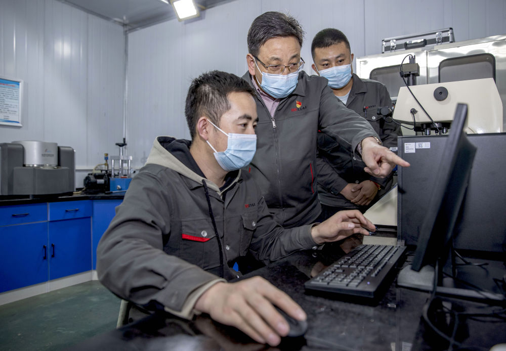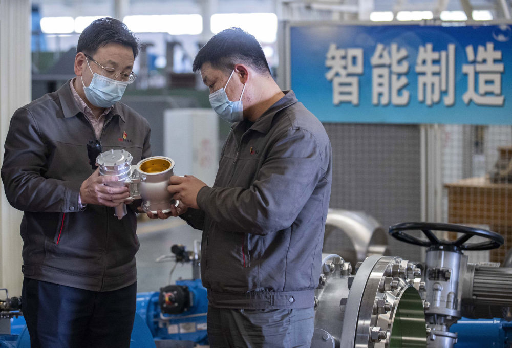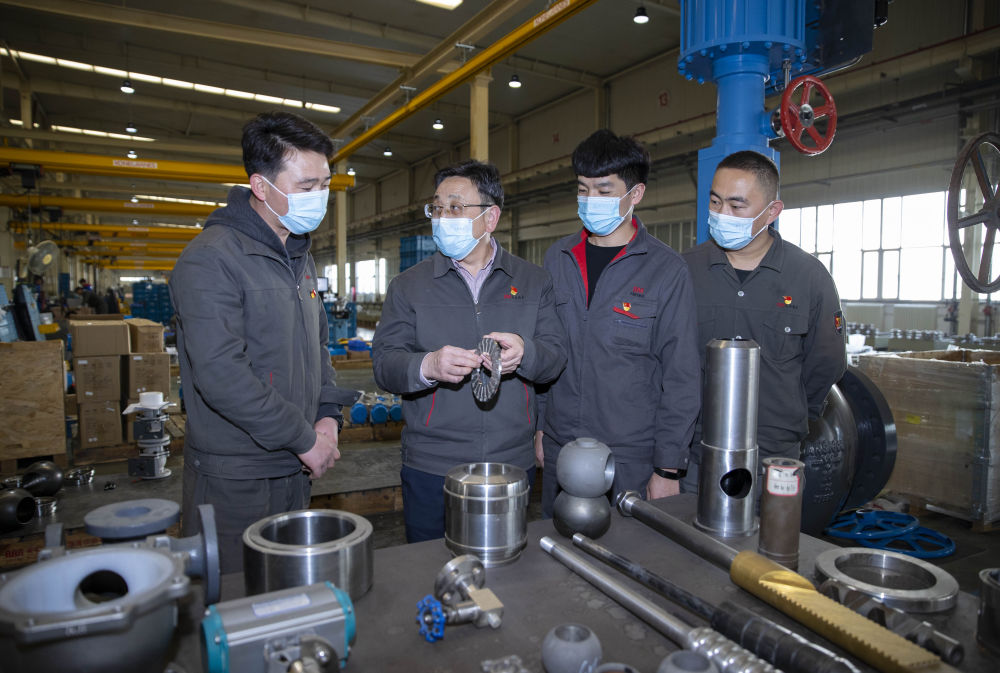 在位于寧夏吳忠市的吳忠儀表有限責任公司高端控制閥基礎研究重點試驗室內,馬玉山(中)與技術人員交流(11月12日攝)。