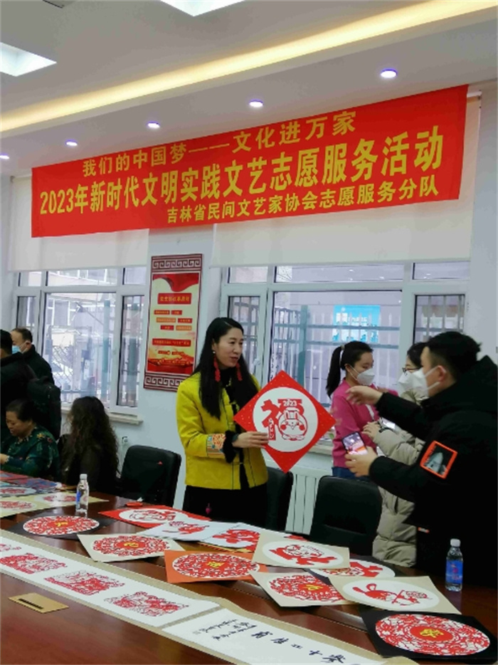 在南關區曙光街道平陽社區新時代文明實踐站,“我們的中國夢──文化進萬家”2023新時代文明實踐文藝志愿服務活動正在火熱進行,一項項豐富多彩的節慶活動吸引了很多居民。一樓大廳內大家團團圍坐,吉林省民間文藝家協會志愿服務分隊的各路高手們正在現場表演、創作,很多居民跟著欣賞、學藝,一張張栩栩如生、喜氣洋洋的剪紙,一個個惟妙惟肖、美好寓意的糖人,傳統文化技藝體現節日內涵,讓“年味”越來越濃。