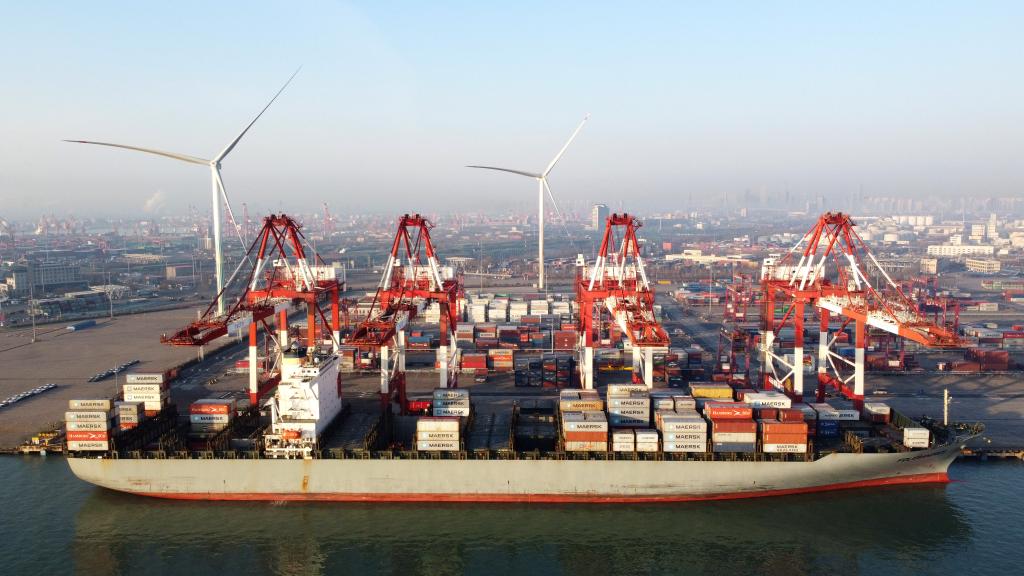 1月1日,一艘貨輪靠泊在天津港聯盟國際集裝箱碼頭進行裝卸作業。新華社記者 趙子碩 攝