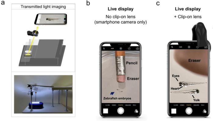 論文作者展示“熒光鏡”的能力顯示,用其成像活斑馬魚胚胎(長度為2-3毫米),這些樣本在脊髓、心臟或后腦表達(dá)了熒光蛋白。他們發(fā)現(xiàn),夾式的鏡頭提供了大約5倍放大效果,能夠成像綠色和紅色熒光組織,分辨率可達(dá)10微米——足以看到單個(gè)色素細(xì)胞。他們還用“熒光鏡”檢測了胚胎的心率,并在用免費(fèi)軟件強(qiáng)化了視頻記錄清晰度后,檢測了個(gè)別心室的活動(dòng)。