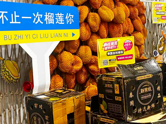 在收銀臺可以看到,幾乎每一位結賬的顧客購物車里都有一只榴蓮。一位顧客說,今天這個泰國金枕榴蓮是花19.9元一斤買的,比菜市場還要優惠一些,品質還要好很多。