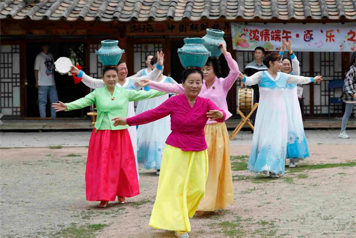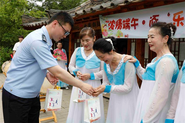 6月20日,在吉林省圖們市月晴鎮(zhèn)白龍村“百年部落”民俗園,來自圖們出入境邊防檢查站和圖們團(tuán)市委的青年志愿者,現(xiàn)場為游客和群眾派發(fā)粽子,表演朝鮮族節(jié)目,與村民一起載歌載舞,感受端午節(jié)的民俗魅力。(吉林日報全媒體記者 丁研)