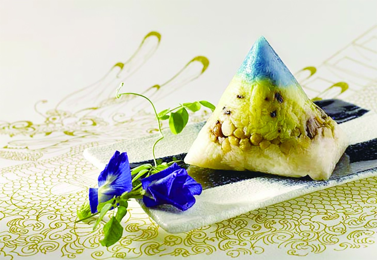 有一些娘惹粽的一角或是一部分是藍色的,那是因為娘惹們喜歡把一種可食用蘭花放到清水里攪煮成靛藍色汁液,將其用作天然色素。蘭花經日曬變成干花,只需放入滾燙的水煮上10分鐘,即會變成天然的藍色色素。加工好的糯米分成兩個部分,一份大,一份小,小的那部分糯米里倒入蘭花汁浸泡。包粽子時先在底部填入1大勺藍米,1小勺白米,然后把2大勺的餡料填入,再鋪上2大勺白米,左右兩角各放上一小撮藍米,蓋上一片香蘭葉。這樣,亮麗的藍色糯米配上晶瑩的白色糯米,宛如娘惹服飾一樣,鮮艷奪目。既是視覺上的享受,也是味覺上的滿足。也是因為如此,娘惹粽子里最受喜愛的就是蘭花粽。