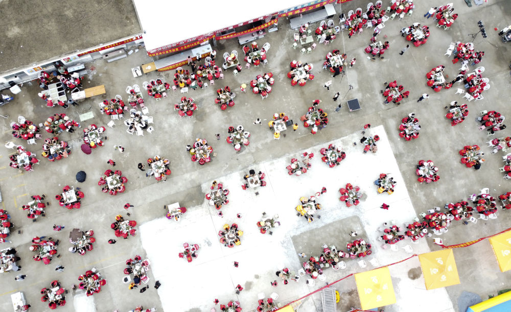 6月20日,湖北省襄陽市襄城區臥龍鎮鄢洲村村民在村廣場上一起包粽子、迎端午(無人機照片)。新華社發(楊東 攝)