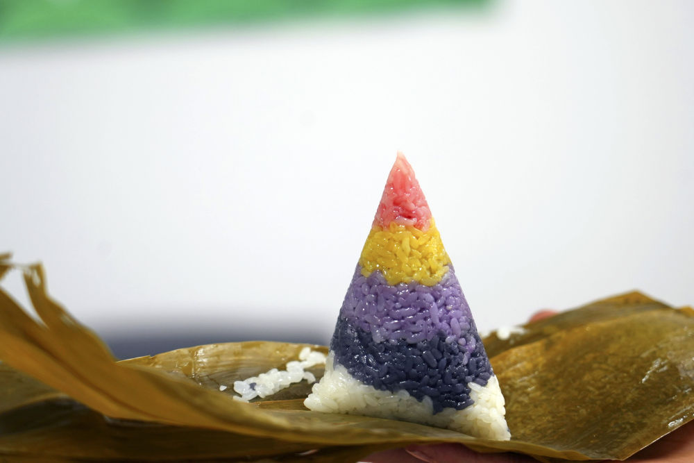 6月15日在貴州省黔東南苗族侗族自治州臺江縣排羊鄉的一處粽子生產車間里拍攝的五彩粽子。新華社發(邰春 攝)