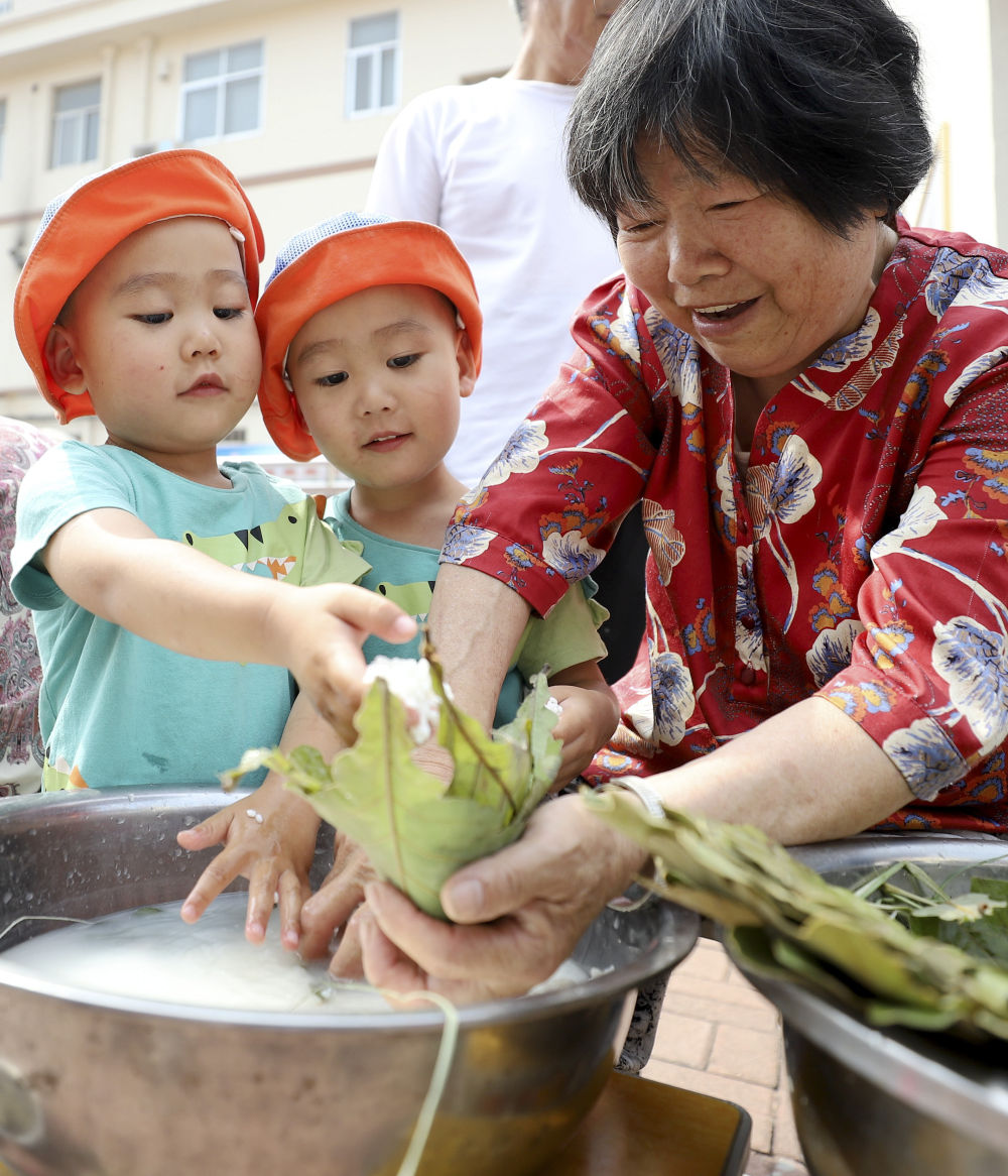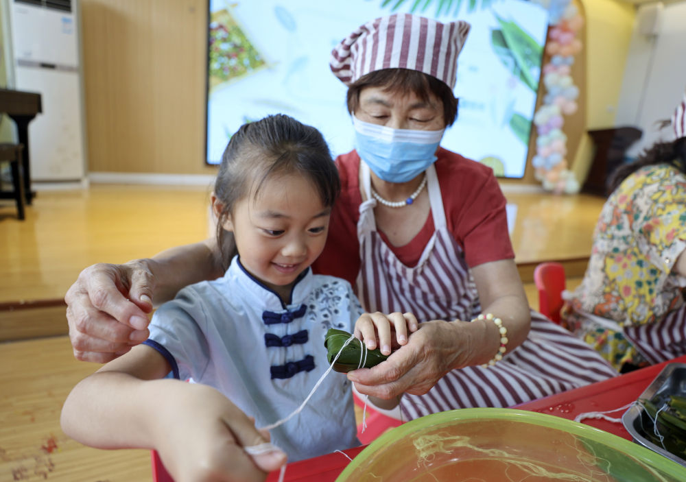 6月20日,在河南省開封市新街口幼兒園,家長跟小朋友一起制作粽子。新華社發(石斐 攝)