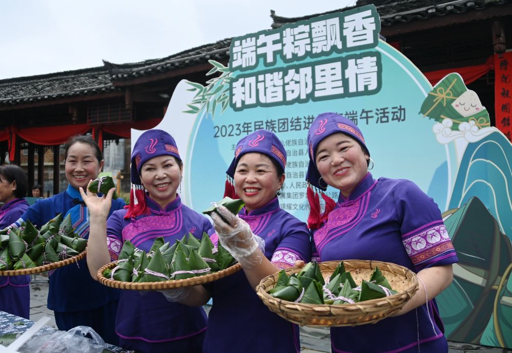 6月20日,在廣西羅城仫佬族自治縣東門鎮石圍古村舉行的“端午粽飄香,和諧鄰里情”活動中,人們展示包好的粽子。新華社發(蒙增師 攝)