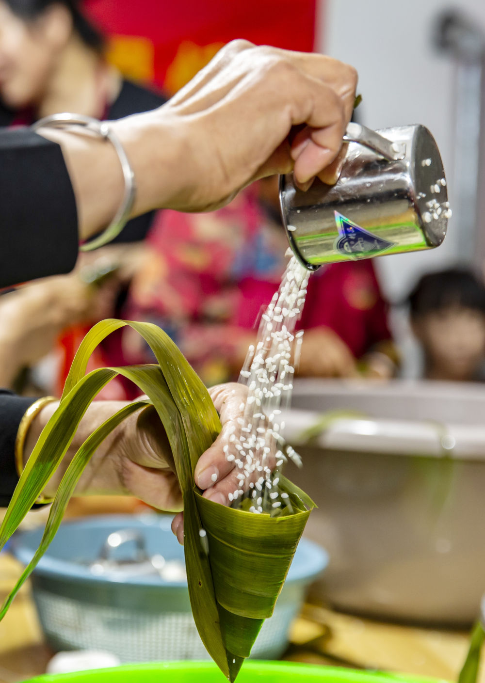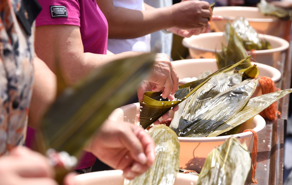 6月17日,在貴州省黔西南布依族苗族自治州冊亨縣舉行的“盛夏賦雅趣,錦繡滿粽香”端午節活動中,居民在包粽子。新華社發(劉朝富 攝)