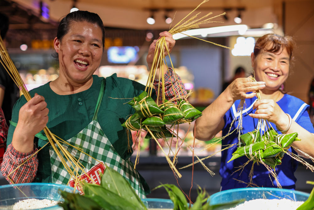 6月19日,在貴州省黔東南苗族侗族自治州丹寨縣一家超市,參加包粽子比賽的顧客展示包好的粽子。新華社發(楊勝賢 攝)