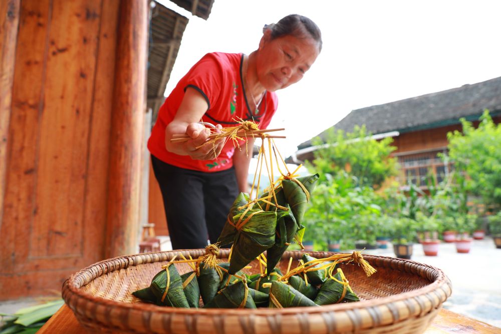 6月16日,在貴州省黔東南苗族侗族自治州劍河縣柳川鎮加禾村,村民擺放剛煮熟的粽子。新華社發(吳昌連 攝)