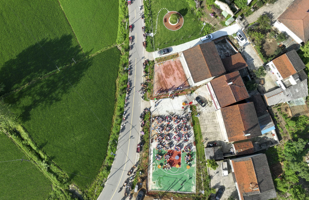 6月20日,在山東省臨沂市蘭山區方城鎮,數十個村子的上千人參加包粽子比賽(無人機照片)。新華社發(孫磊 攝)