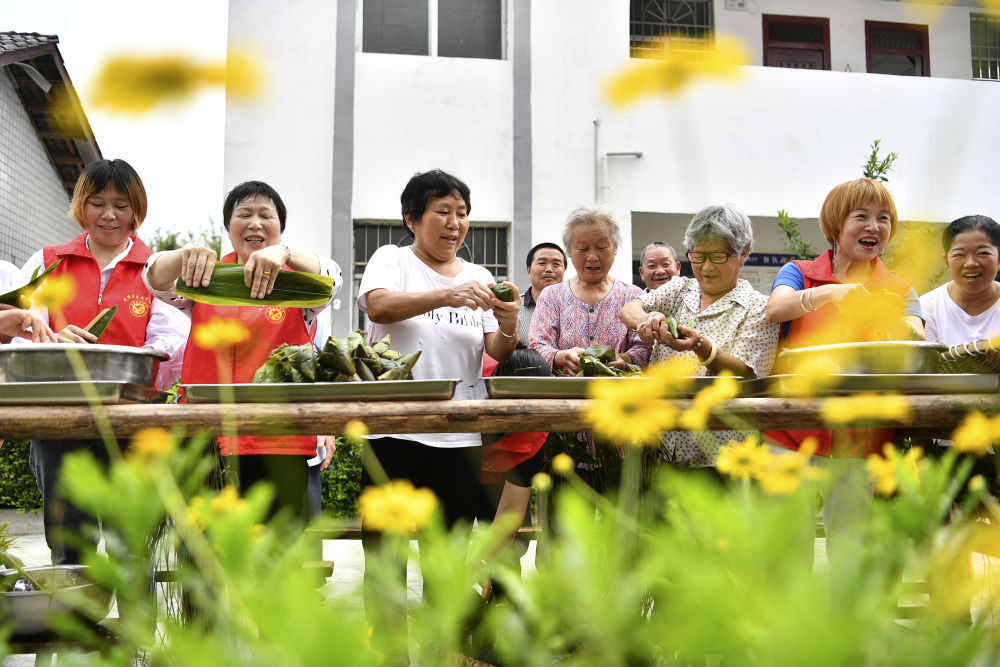 6月20日,四川省廣安市前鋒區志愿者在觀閣鎮敬老院與老人們一起包粽子迎端午。新華社發(張啟富 攝)