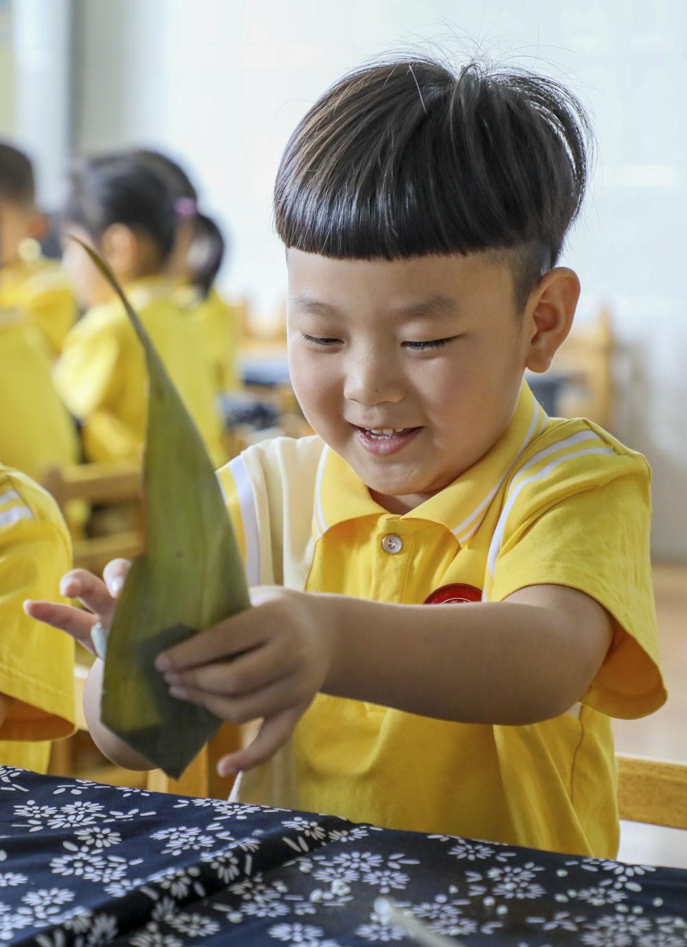 6月20日,山東省滕州市書院小學幼兒園的小朋友學習包粽子。新華社發(宋海存 攝)