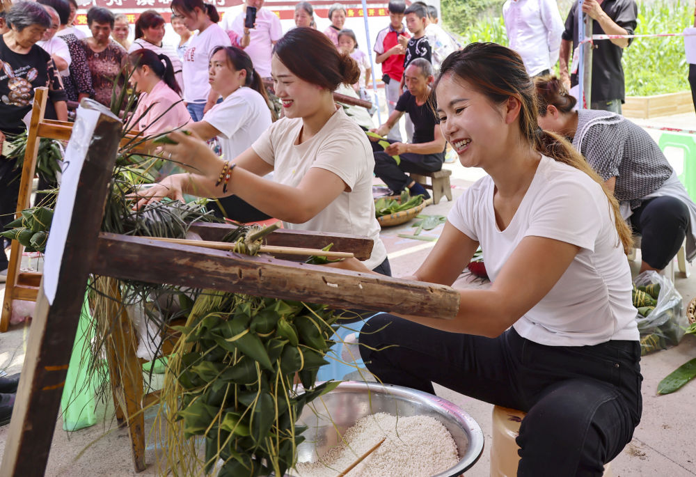 6月17日,在貴州省遵義市新蒲新區新舟鎮群樂村舉行的“粽香迎端午,增進鄰里情”活動中,村民參加包粽子比賽。新華社發(簡墾 攝)