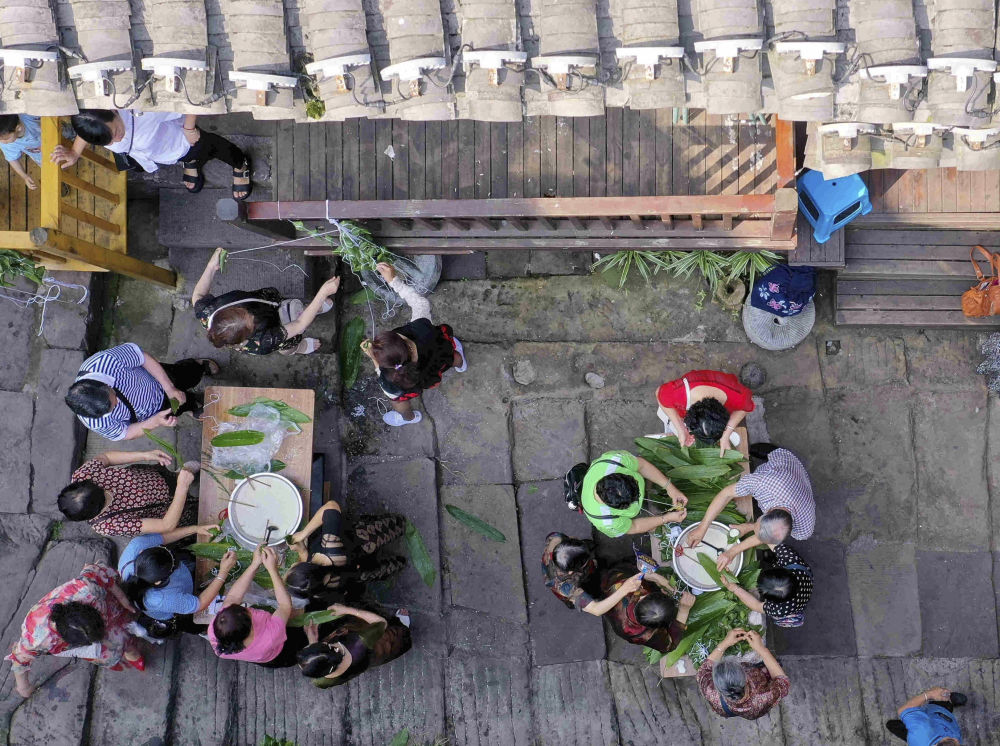 6月20日,貴州省赤水市市中街道濱江社區居民參加包粽子比賽(無人機照片)。新華社發(茍煉煒 攝)