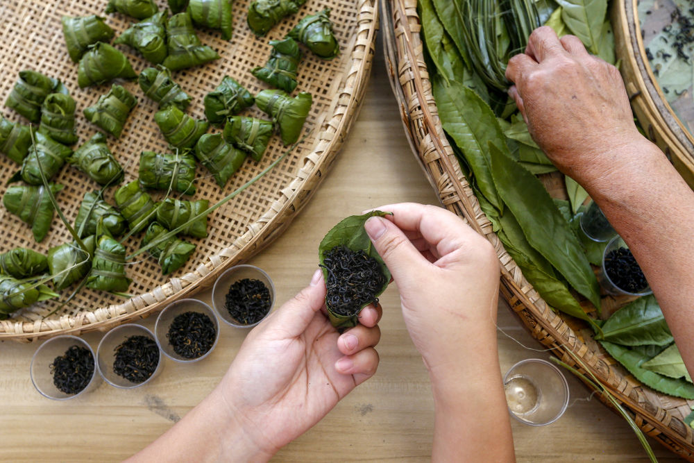 6月14日,在安徽省黃山市祁門縣平里鎮平里村,茶工把祁門紅茶作為“餡料”,用傳統包粽子的手法制作“粽茶”。新華社發(施亞磊 攝)