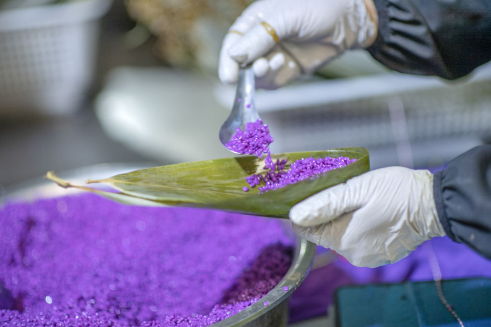 6月18日,在云南省文山壯族苗族自治州丘北縣一食品加工企業,工人在制作五色粽子。新華社發(熊平祥 攝)