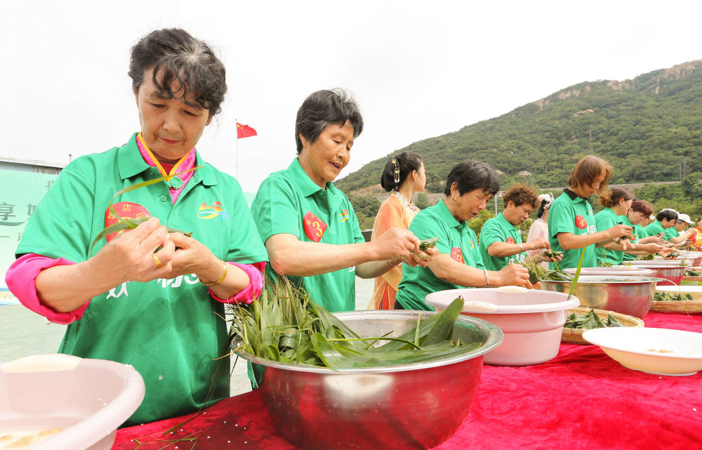 6月18日,在江蘇連云港市連云區高公島凰窩風景區,人們在端午民俗文化活動上參加包粽子比賽。新華社發(王健民 攝)