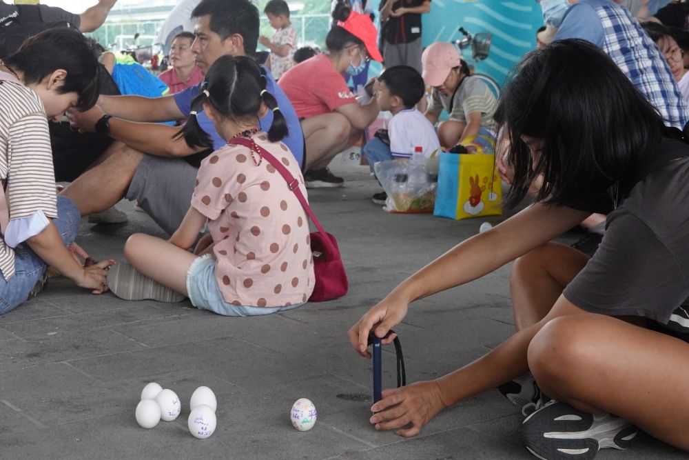 在大佳河濱公園的活動現場,許多家長帶著孩子,用彩筆在雞蛋殼上或繪制各種圖案,或寫下自己的名字和“端午快樂”等字樣,然后嘗試把雞蛋立起來,既緊張又有趣。人們相信,在端午節這天的正午時分,成功把雞蛋豎立起來會給自己和家人帶來一年的好運。