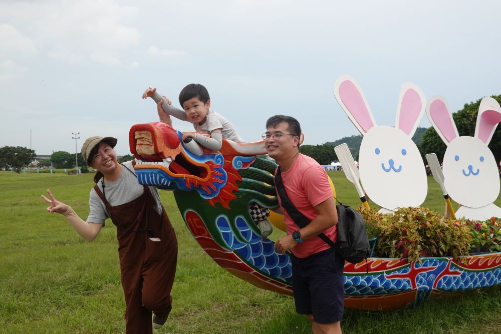 6月22日,民眾在臺北市大佳河濱公園的端午龍舟裝飾前合影留念。新華社記者 尚昊 攝