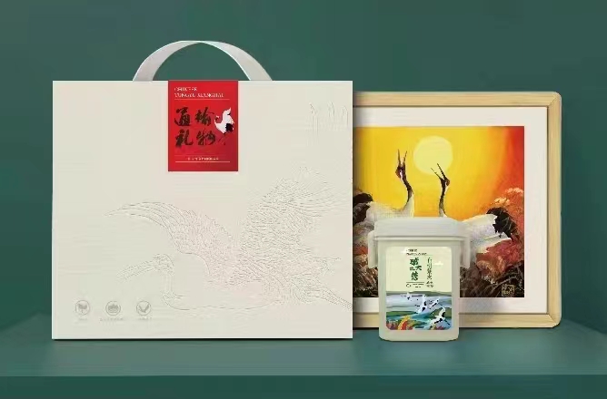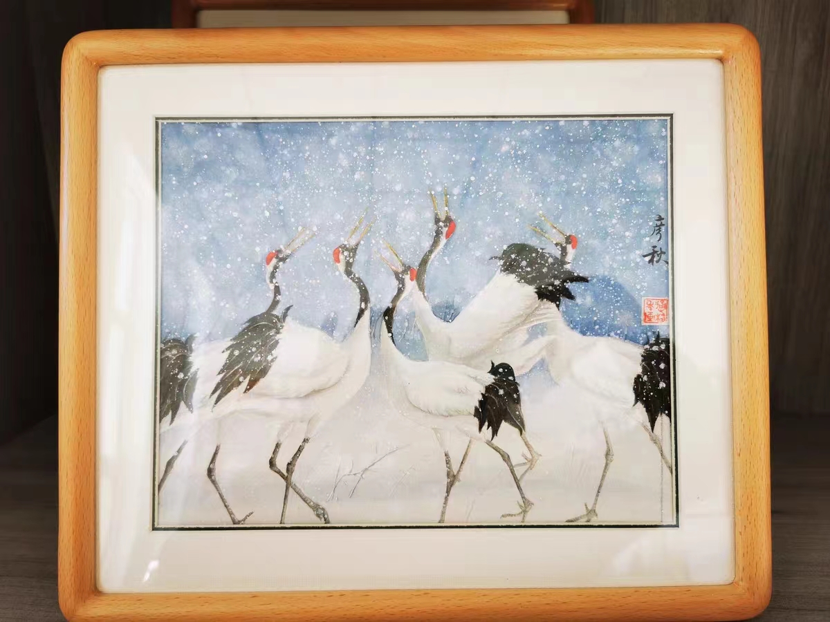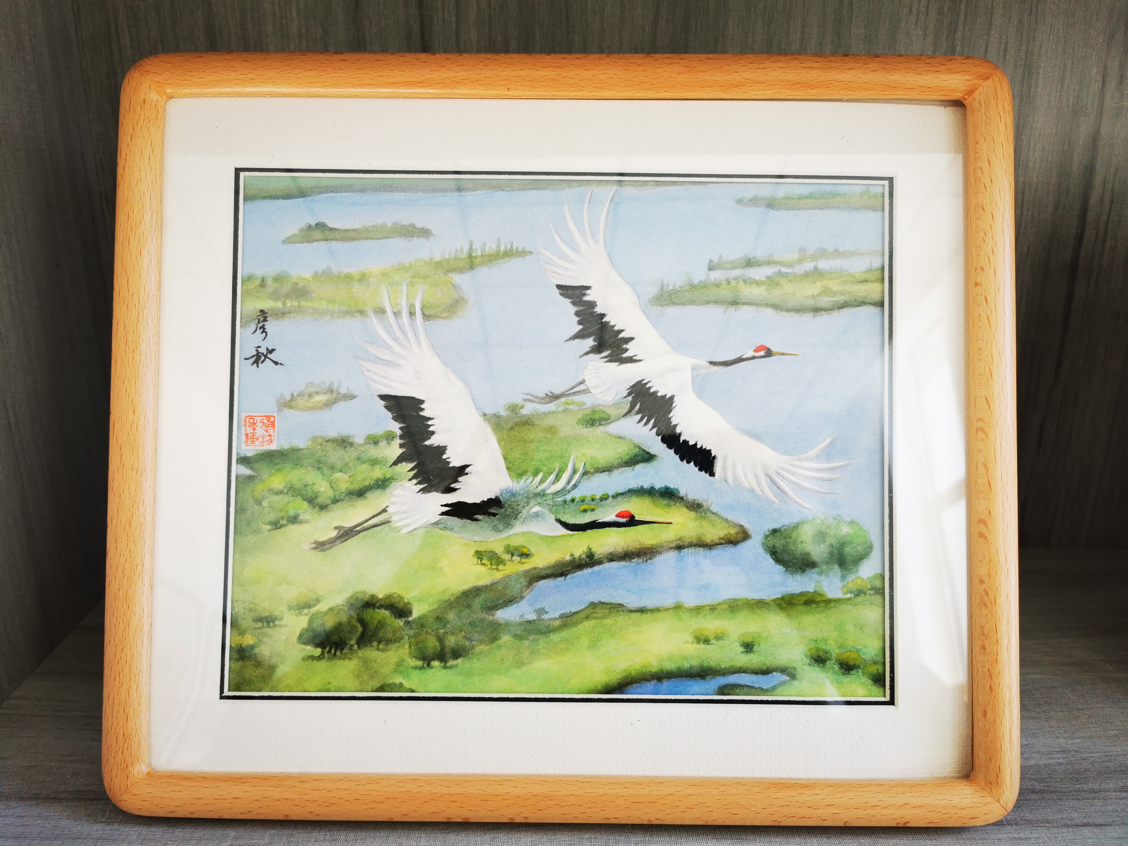 通榆是丹頂鶴之鄉。《鶴鄉風情》系列年畫由通榆年畫藝術傳承人,82歲的老藝術家谷學忠帶領青年畫家施彥秋、寧英明等30余人的創作團隊,采用通榆年畫特有的繪畫技藝精心手繪而成,整個創作歷程長達半年之久。畫作以濕地生靈為題,將鶴鄉一年四季不同情境下的丹頂鶴展現于筆端,畫面中既有春夏秋冬冷暖交替的不同季節環境特色,又巧妙地展示了丹頂鶴的生息繁衍過程。這組作品既兼具濕地環境保護特色,又有較強的地域風情、文化韻味和收藏價值。