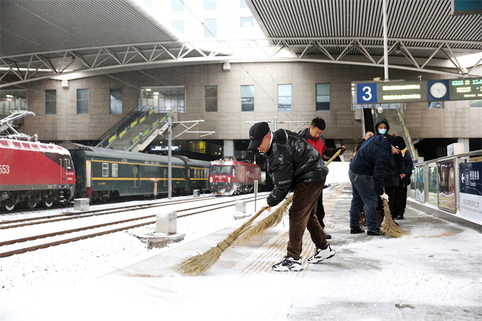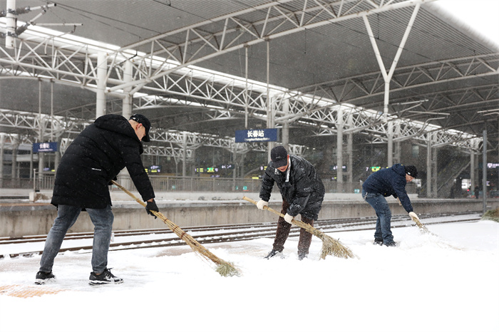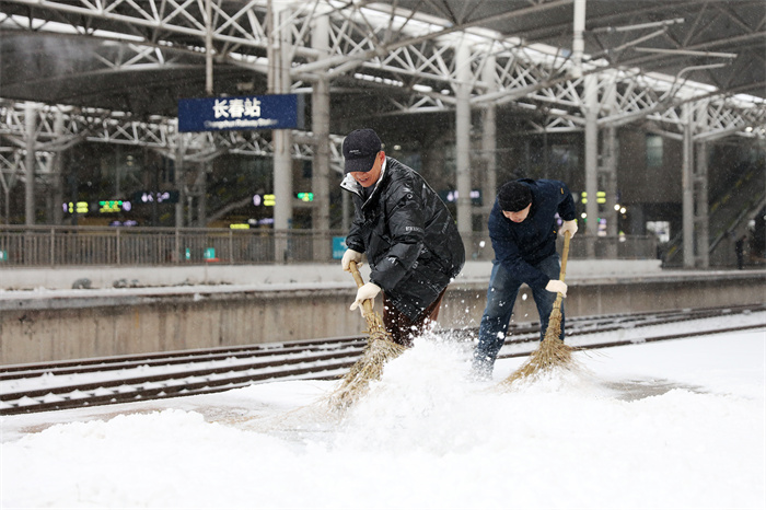 為積極應(yīng)對降雪對鐵路運輸?shù)挠绊懀L春站自11月6日9時起,啟動一級應(yīng)急響應(yīng),做好降雪導(dǎo)致列車晚點、停運等突發(fā)事件的應(yīng)急處置工作。增開售票窗口,備足退票金,力爭在最短時間內(nèi)為旅客免費辦理退票、改簽等業(yè)務(wù);在進(jìn)站口、檢票口、站臺上、臺階下增加引導(dǎo)人員,做好旅客乘降的宣傳引導(dǎo)工作,防止旅客滑到摔傷;組織干部職工隨時做好除雪準(zhǔn)備,對管內(nèi)112組道岔、16個站臺進(jìn)行除雪,做到隨下隨掃,為旅客安全出行保駕護(hù)航。