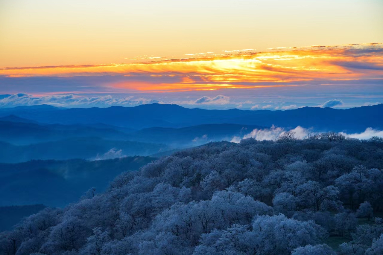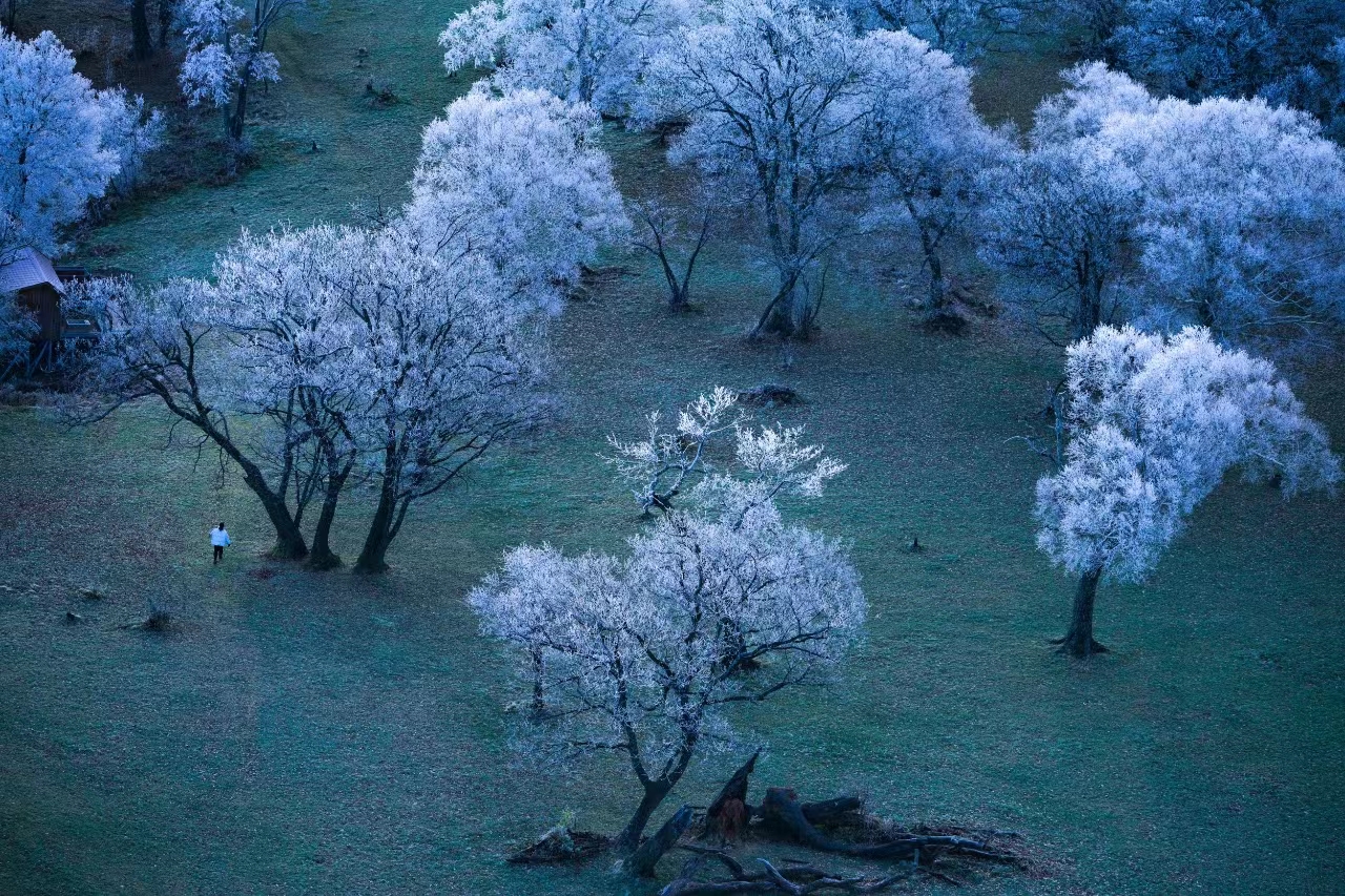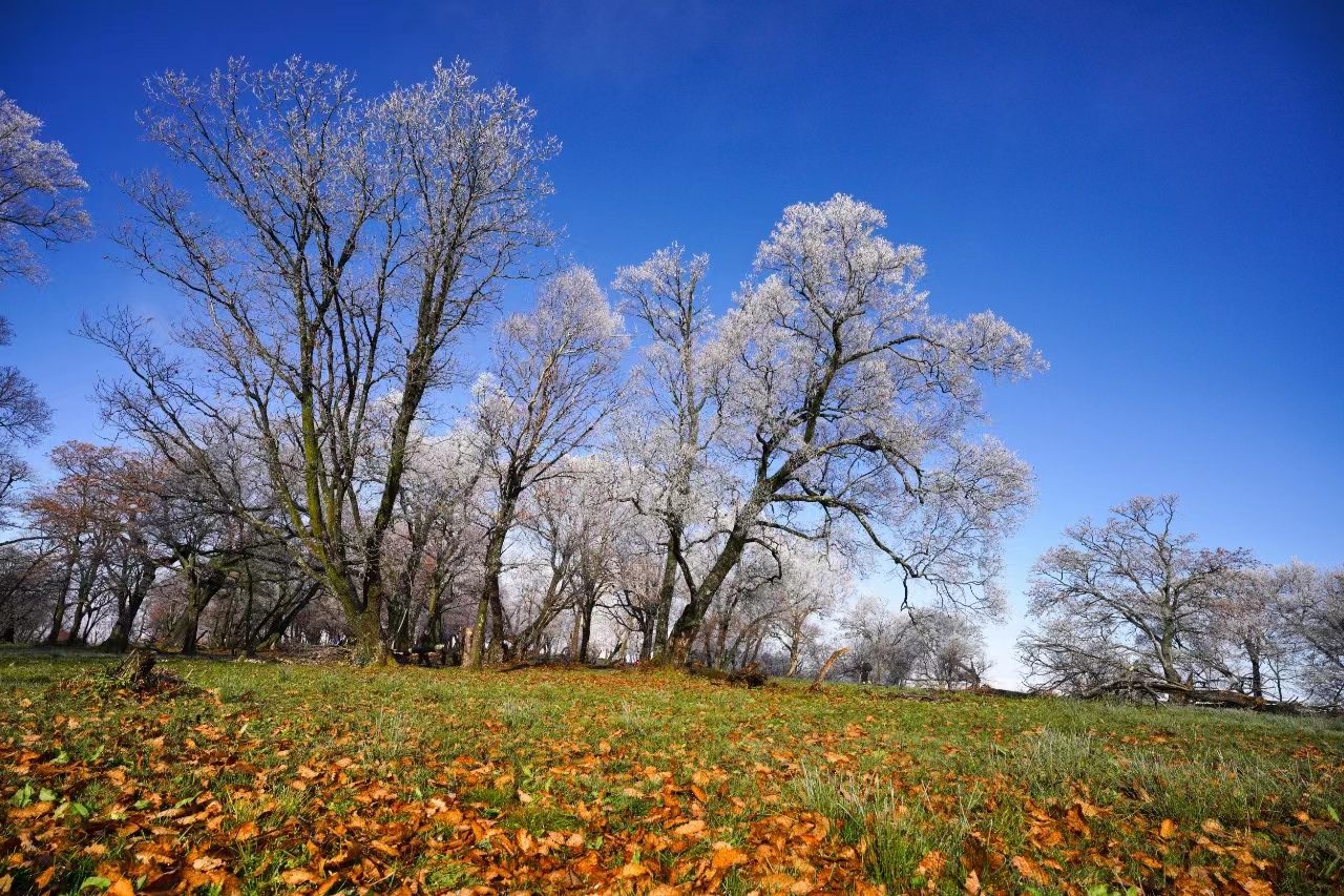 2022年10月4日早晨,草地尚綠,秋葉余紅,因氣溫驟降和霧汽彌漫,輝南縣四方頂子樹木上突然形成霧凇,出現(xiàn)白紅綠相互映襯的自然奇觀。