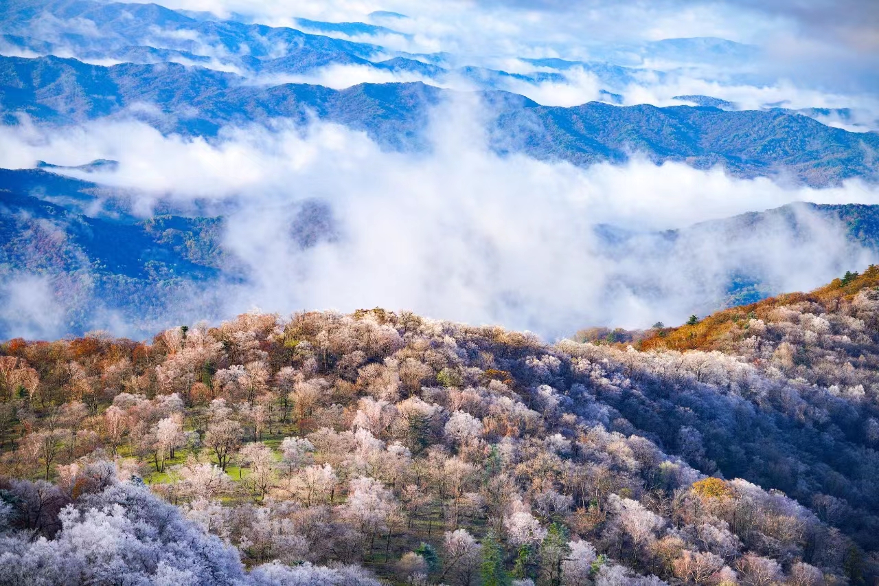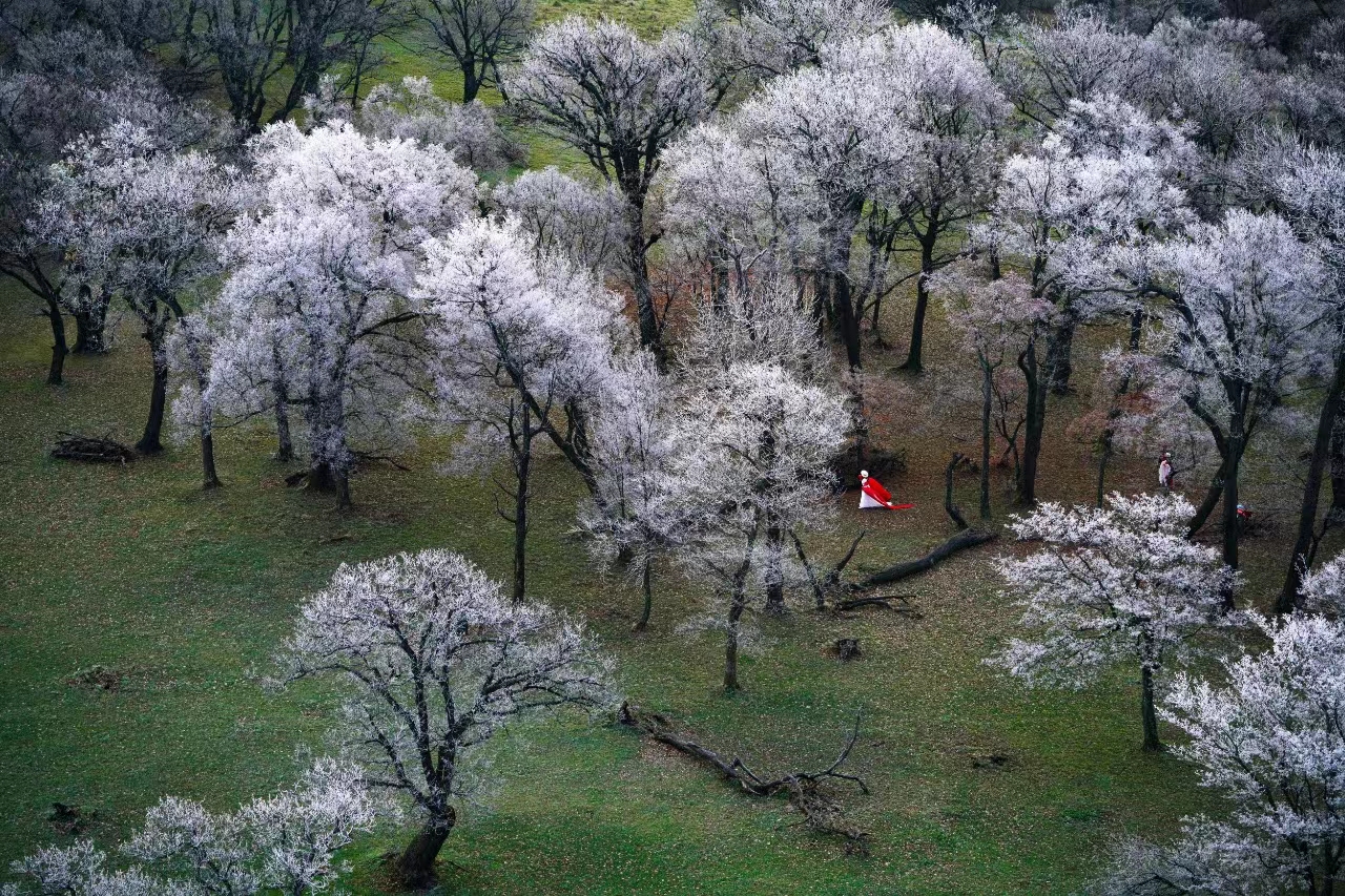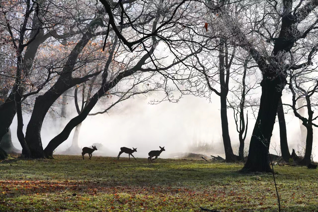 2022年10月4日早晨,草地尚綠,秋葉余紅,因氣溫驟降和霧汽彌漫,輝南縣四方頂子樹木上突然形成霧凇,出現(xiàn)白紅綠相互映襯的自然奇觀。