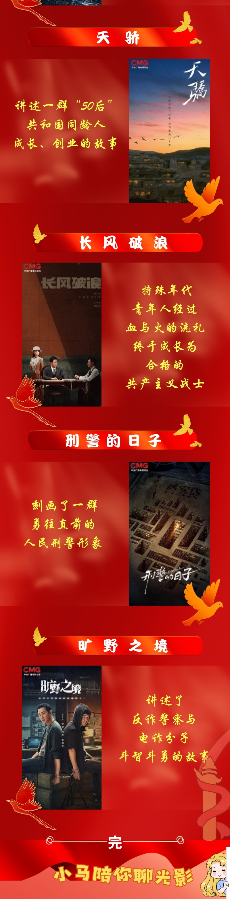 通過這些天的查看和收集資料的過程,小馬深深感受到,這些作品或激蕩時代浪潮,或折射人文關(guān)懷,或積蓄成長力量,或賡續(xù)文化傳承,每一部都是在用生活的不同側(cè)影和獨特的個體感受,去記錄歷史、審視當下,讓觀眾在追劇的過程中不僅能感受獨特的藝術(shù)魅力,也能從中汲取到豐富的精神養(yǎng)分。