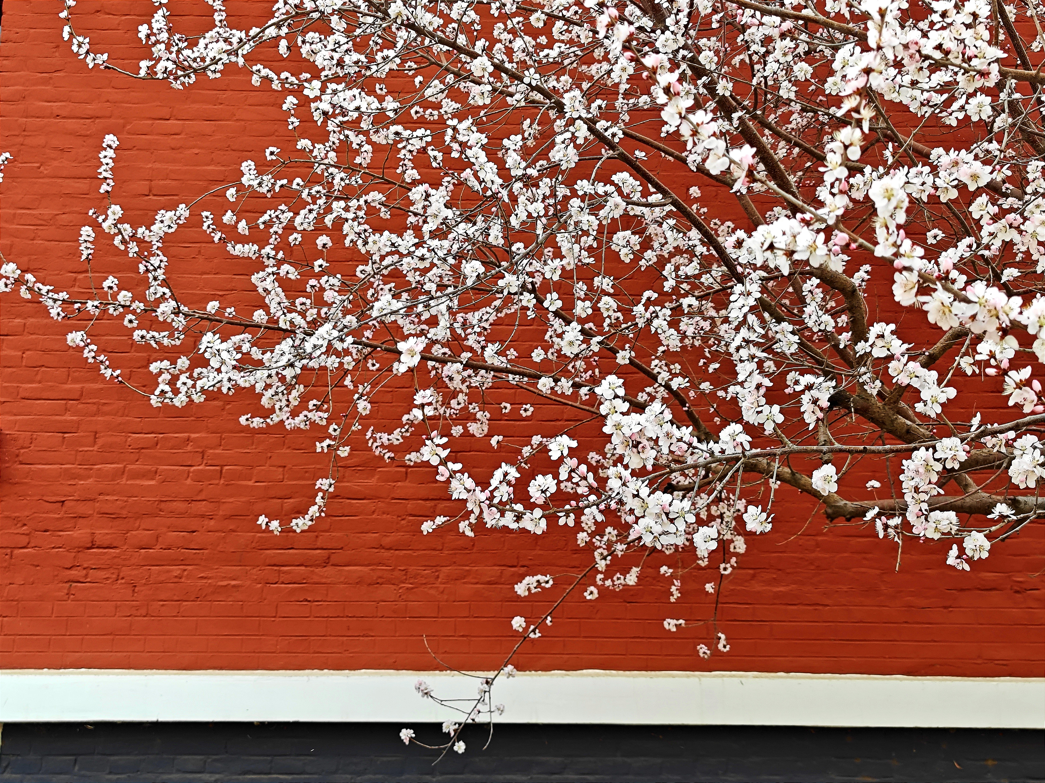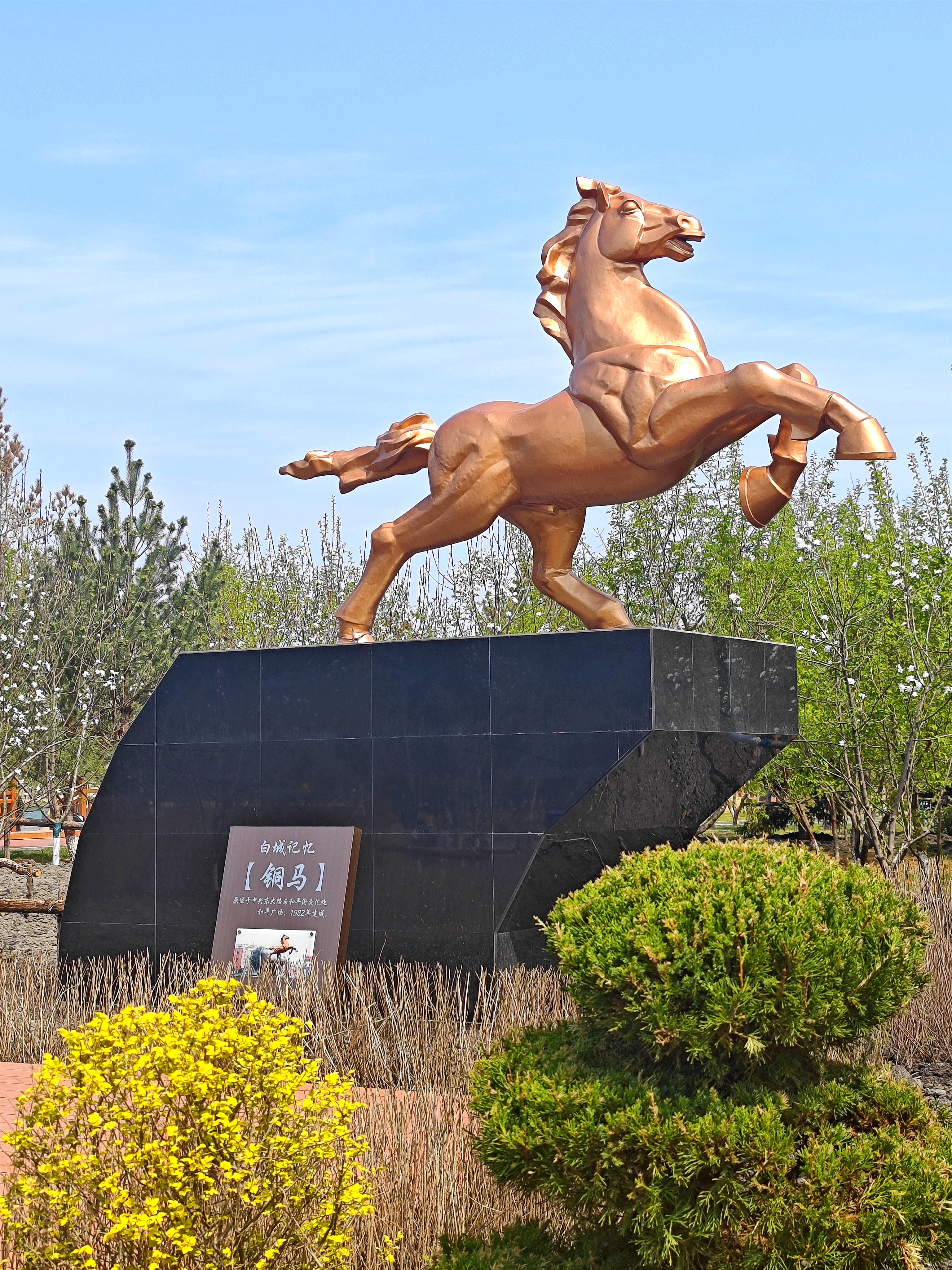 銅馬——深銅色,馬眼圓睜、昂首嘶鳴、前蹄躍起、馬尾飄揚,奮力向前之姿似御風而行。整座雕像掩映在杏花叢中,于柔弱中更顯剛強,銅馬花香,相得益彰。